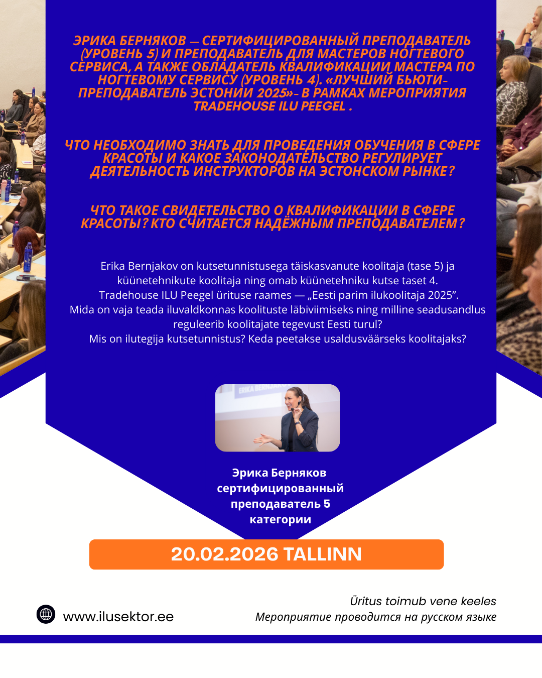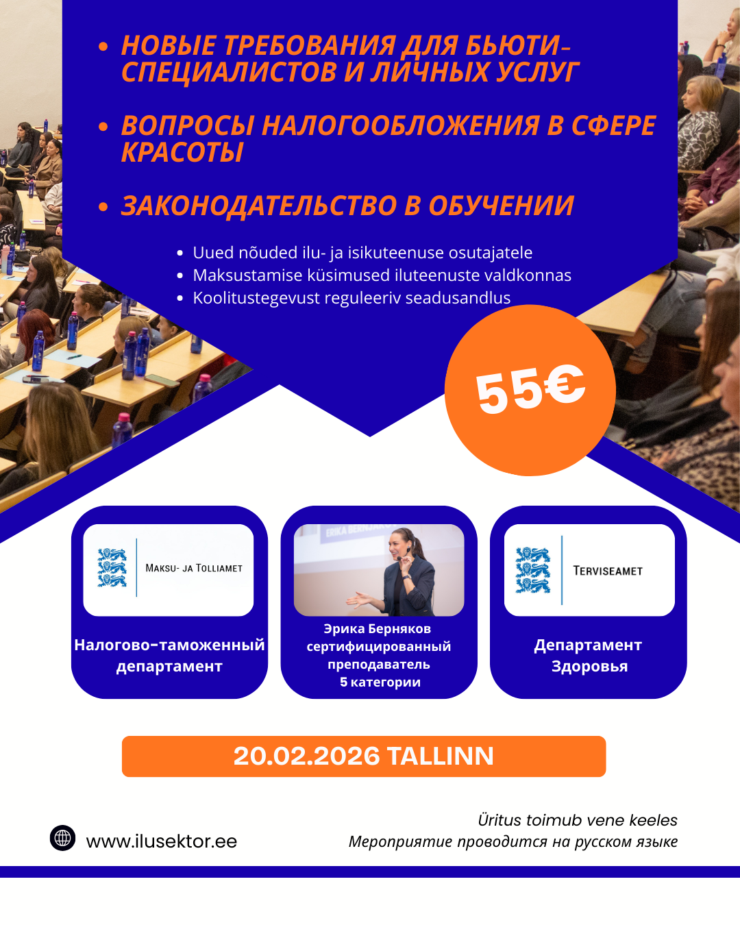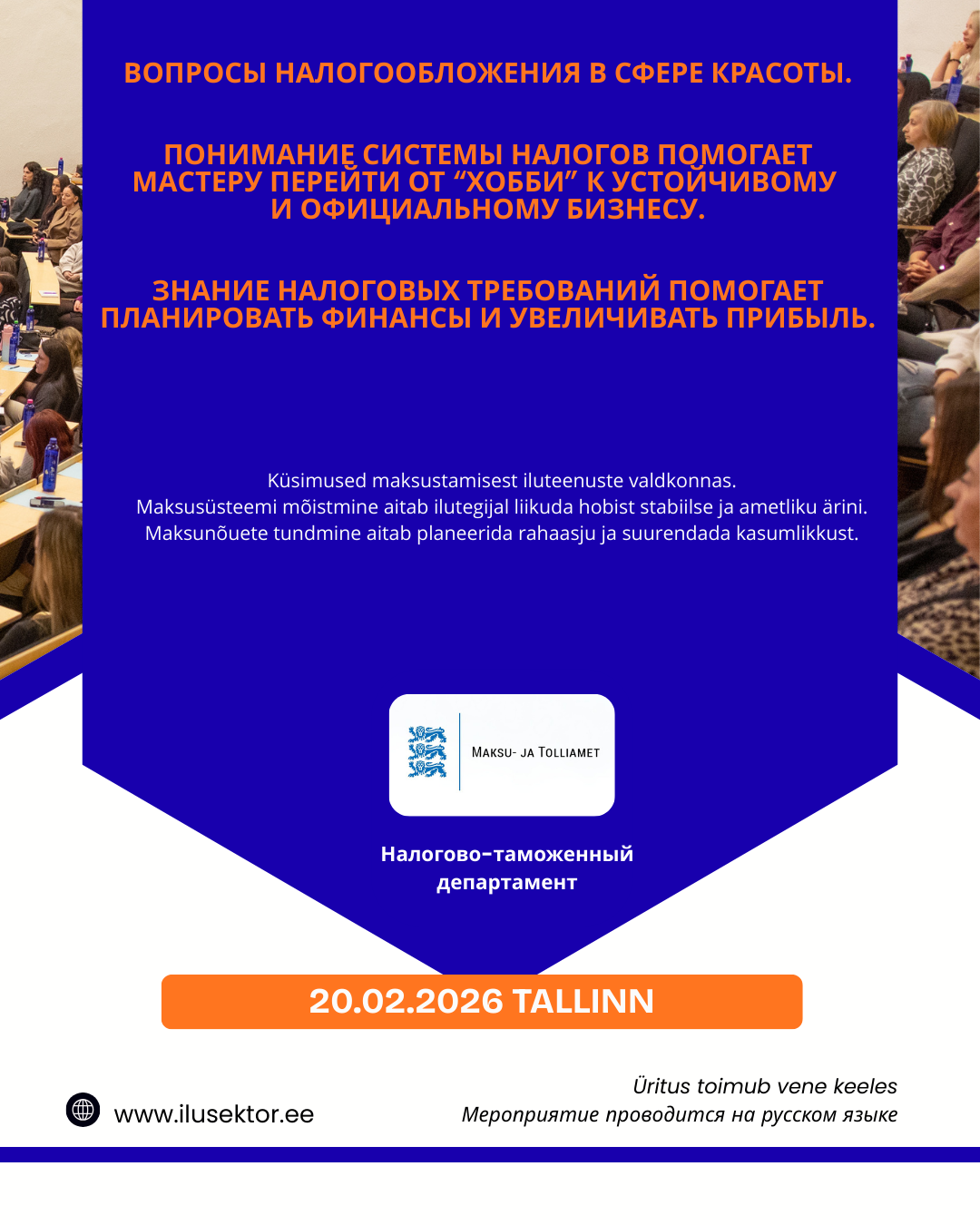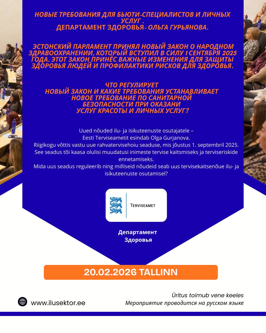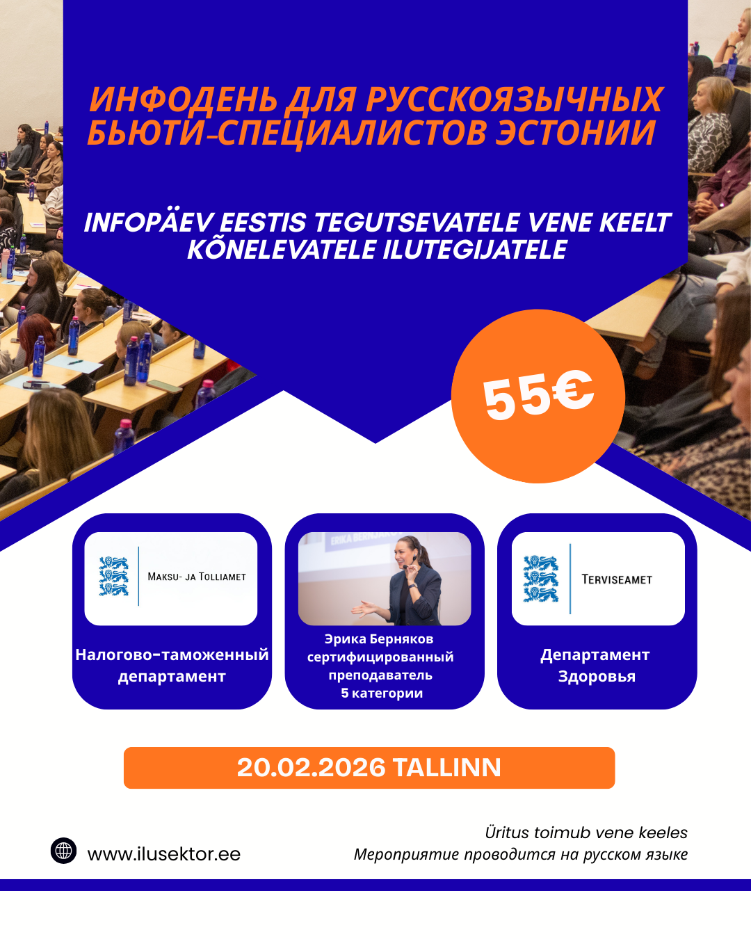 20 февраля 2026 года в Эстонии состоится информационный день, предназначенный для русскоязычных специалистов индустрии красоты, работающих в Эстонии во всех направлениях бьюти-сферы. Это содержательный и практический день, посвящённый важным темам, законам и требованиям, актуальным для индустрии красоты.
